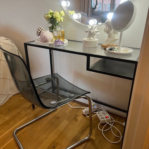 Kan använda som litet skrivbord, sminkbord eller avlastningsbord.