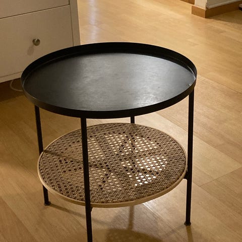 Bra soffbord med missfärgad skiva. För den som inte bryr sig eller för den som vill måla/lacka om eller lägga på en ny skiva. Därav pris!