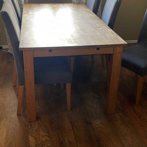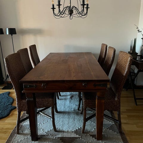 Ett ovalt matsalsbord med tillhörande stolar. Fint skick och totalt 12 personer sitter bra då storleken är flexibel tack vare iläggsskivorna. Inga vassa kanter då bordet är ovalt. Bordet är nedmonterat för enkel transport.