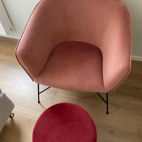 Säljer en jättefin rosa stol som vi har haft en fårpläd på passar jättefint designmässigt. Som ny inte speciellt använd.