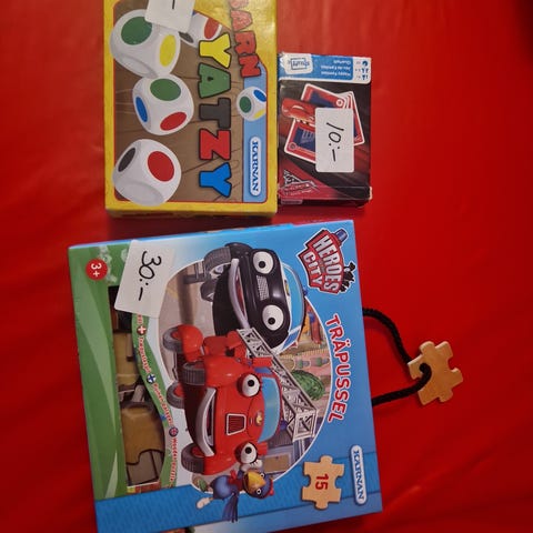 Ett set som består av ett oöppnat pussel, ett mini pussel, en kortlek och ett yatzy (båda lite använt).
