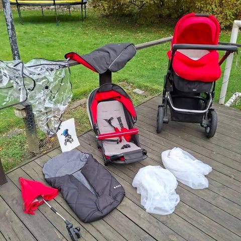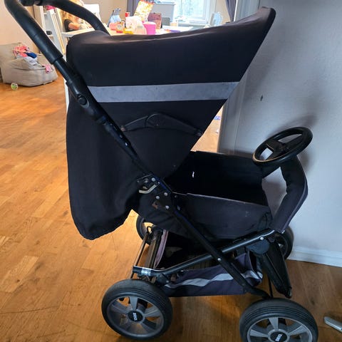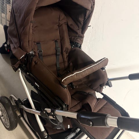 Mycket bra och lättanvänd barnvagn. Liggvagn som sedan blir sittvagn. Liggdel med madrasser. Varm åkpåse för vintern medföljer.