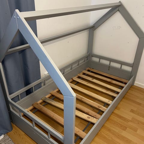 Sängen och madrassen är i fint skick och sparsamt använda. Madrassen är knappt använd och sängen har några mindre märken från normalt bruk. På baksidan av sängramen sitter en diskret “gardinlina” som vi satt dit och använt för en tunn gardin (se bild).