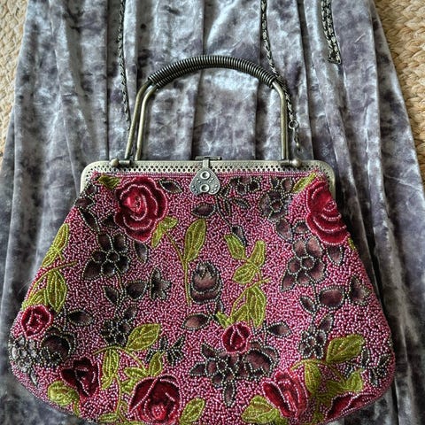 Väskan är ca 27 cm bred, ca 15 cm hög. Axelremmen är 60 cm lång.