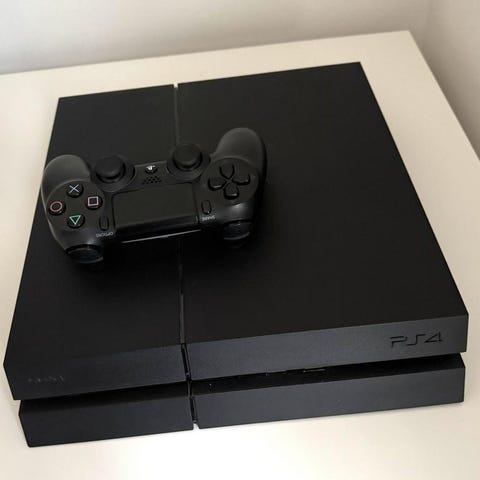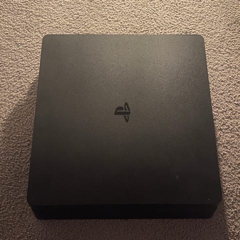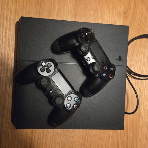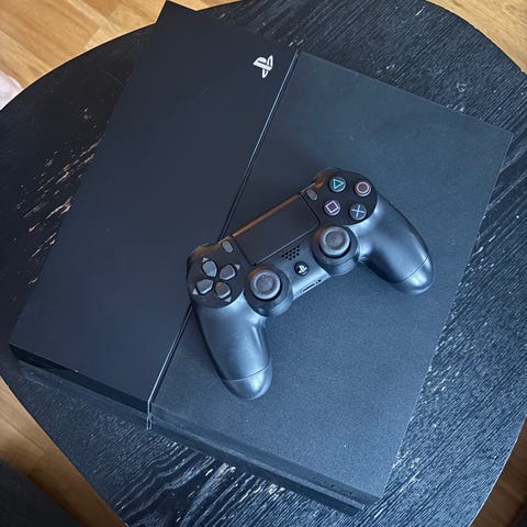 Sony Playstation 4 Spelkonsol med en svart trådlös handkontroll. Konsolen är svart och har en kompakt design. Handkontrollen är ergonomiskt utformad och har standardknappar för Playstation 4.