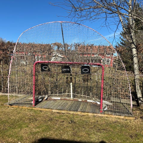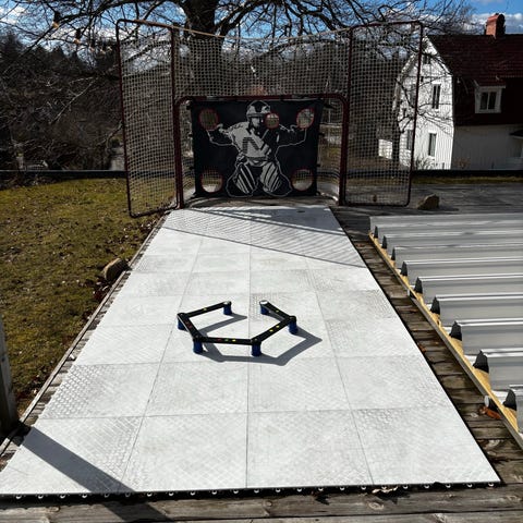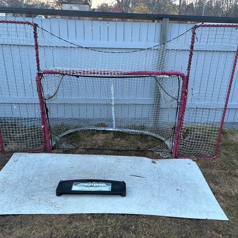 Vi säljer en förstärkt målbur i fullstorlek, måltavlor, 70 st smetfria träningspuckar, ett komplett skyddsnät med ram och stolpar samt en byggbar plastis.