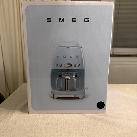 SMEG kaffebryggare med svart färg och glas kanna. Utrustad med flera kontrollknappar på framsidan för enkel användning. Passar för att brygga kaffe och har en design som kombinerar funktionalitet med retrostil.