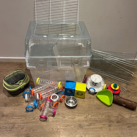 Hamsterbur med allt som behövs. Inkl hjul, vettenflaska, hus, leksak, matskål.