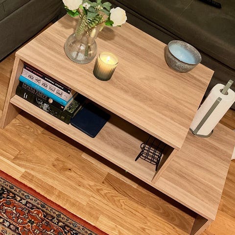 Massivt bord från MIO, köptes ett par år sedan. Hjul på benen har monterats i efterhand, det kan man ta bort.