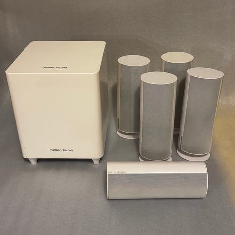 Harman Kardon TS11 högtalarsystem med aktiv subwoofer och 5 satellithögtalare. Väggfästen finns för två, kablar finns för alla och de är långa originalkablar.