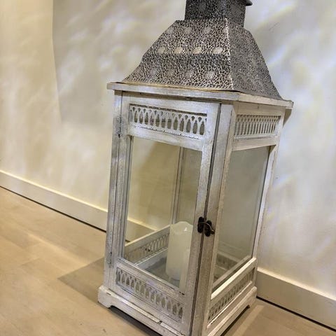 Detaljrik ljuslykta i orientalisk stil. Tre ljushållare i olika höjd innanför glaset, som med sitt mönster ger ett fin sken.