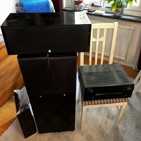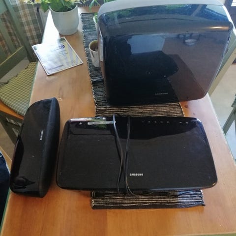 Enkelt hemmabiosystem. En subwoofer, en soundbar och 2 mindre högtalare. Kontroll, Elkablar och aux. kablar följer med. Säljes pga. Inköp av nytt system, prutbar vid snabb och smidig affär. Skriv om du/ni undrar något över produkten!
