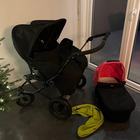 Emmaljunga med liggdel sittdel åkpåse regnskydd myggnät kommee från djur och rökfri hem