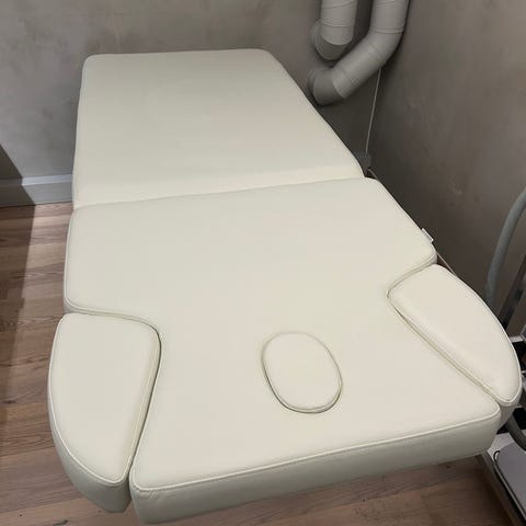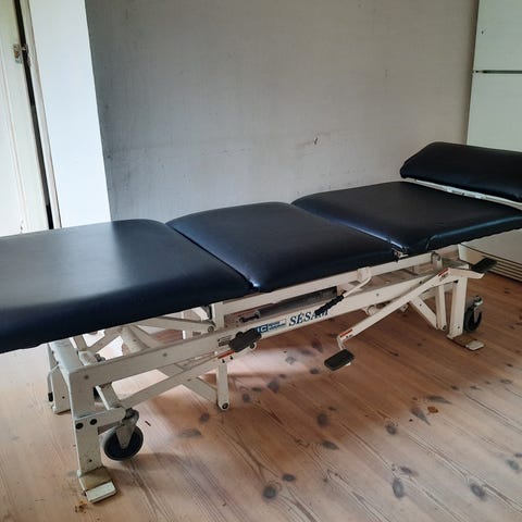 Vit justerbar behandlingssäng med armstöd. Sängen har flera sektioner som kan justeras för olika positioner, vilket gör den lämplig för behandlingar. Behandlingssängen är mycket tung, hjälp behövs vid hämtning.