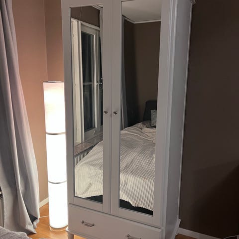 IKEA Aage Petersen Garderobsskåp i vitt utförande. Skåpet har två dörrar med handtag och inredning som inkluderar en klädstång för hängande kläder samt hyllor för förvaring av vikta plagg eller andra föremål. Passar för förvaring av kläder och accessoarer i hall eller sovrum.
