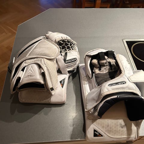 Bauer Supreme ishockeyskridskor målvaktshandske i röd och vit färg. Handsken är designad för målvakter och visar tecken på användning men är i funktionellt skick. Materialet består av slitstarka syntetiska material för skydd och flexibilitet vid spel.