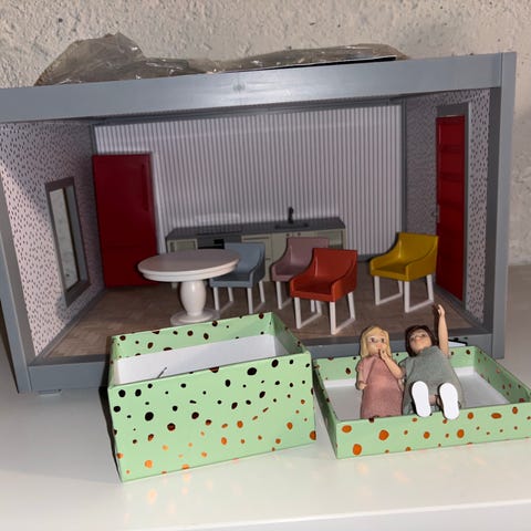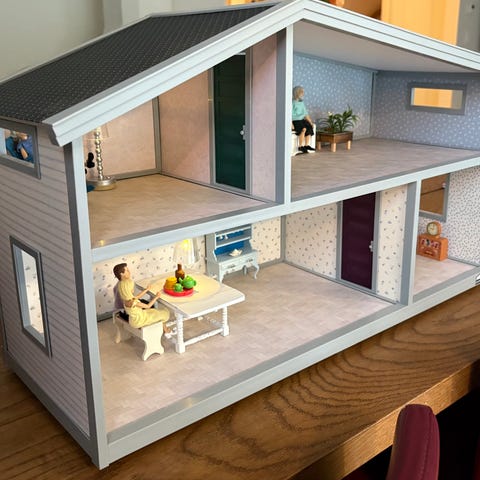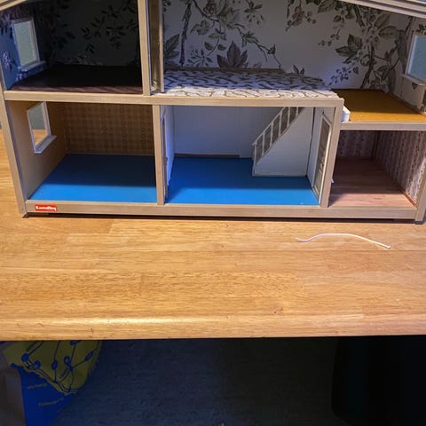 Lundby Dockskåp i trä med flera rum och olika möbler inklusive köksutrustning, soffor, bord och stolar samt sängar. Passar för barnlekar och samling av dockhusmöbler. Obs! Skickas ej.