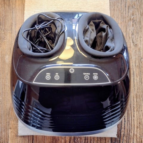 mycket fin Beurer Fotmassageapparat i vit färg med nätöverdrag. Utrustad med strömknapp för enkel användning. Designad för fotmassage med flera massagepunkter för stimulering och avslappning.