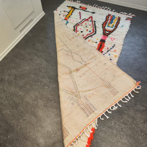 Den är precis hemtagen från Marocko, men tyvärr passade den inte alls i rummet där vi tänkt ha den – därför säljer vi den nu. Mattan är helt oanvänd.