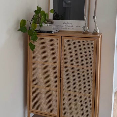 Viborg skåpet är en elegant möbelserie i ek. Skåpet ger dig gott om utrymme för förvaring bakom fyra dörrar. Dörrarna fäster sig via magneter och det garanteras att inget spills ut. Det finns en liten vattenskada på toppen från en blomvas, detta går att täcka med en annan vas eller andra föremål. Annars är den i väldigt god skick! Bilder finns att se.