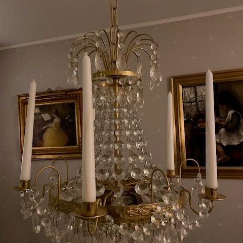 Kristalltakkrona i mässing, mått 60x70cm köpt på Bergmansmöbler