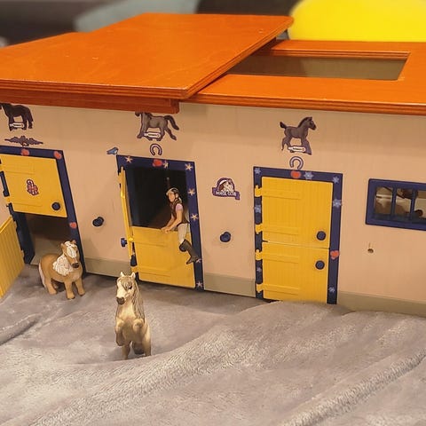 Vid sidan av stallet på första bilden syns också alla extra staketdelar som skickas med för möjligheten att bygga upp en stor hästgård.
