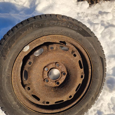 Hankook vinterdäck med fälgar, dimension 175/65 R14. Däcktyp med dubbar för förbättrat grepp på is och snö. Tillverkade vecka 05 år 2024. Fälgar av stål, används för personbilar.