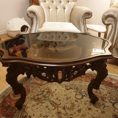 Ett mycket fint soffbord i mycket bra skick. Bordet är tillverkat i trä och har dekorativa detaljer både vid benen och i mitten av bordet. Ovanpå ligger en glasskiva som ger ett elegant och stilrent intryck.