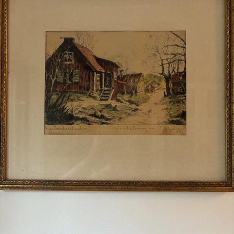 Konstnären Eigil Schwab (1882-1952), Ett litet tryck glaserat i en trästavel, troligen inramad på 1950-talet. Mått ca. 28 x 40 cm. Glaserad inramad kopia, sällsynt vy view från Luleå troligen ingår i den en gouacher serie med motiv från svenska landskap och miljöer, som påbörjades 1928…Tillstånd: Mycket bra skick. [Eigil Vilhelm Schwab (före 1908 Hansen), född 28 mars 1882 i Stockholm, död 4 juli 1952 i Stockholm, var en svensk konstnär, målare, grafiker, keramiker, illustratör, skämttecknare och skriftställare. ].