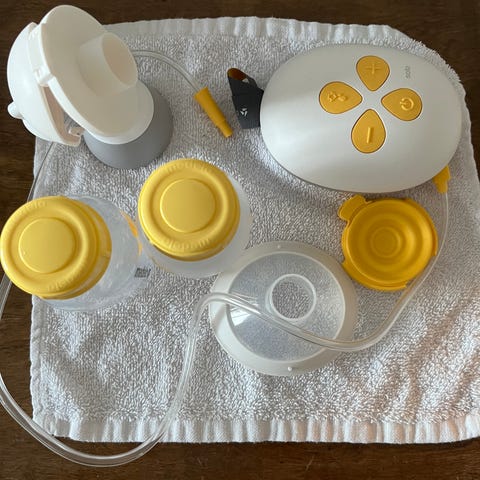 Även ett oöppnat paket Medela frysmjölkspåsar (ca 25 st kvar) följer med.