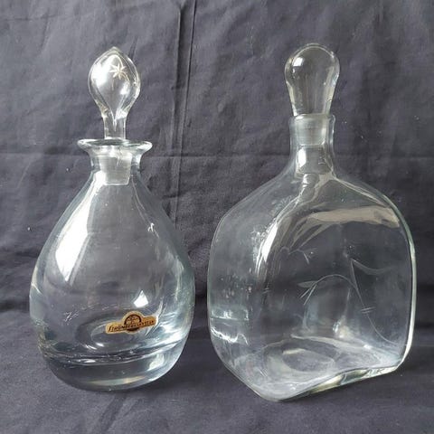 Jungfrukaraff med snapsglas som propp, hantverk från Bergdala glasbruk i Lessebo.