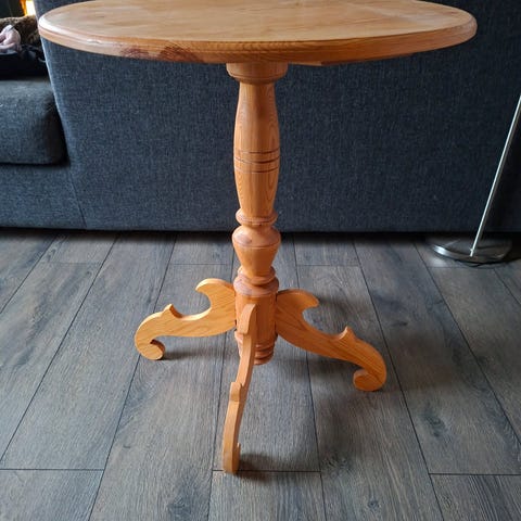 Gammalt cafébord/pelarbord. Ålder okänd. Vitmålat. Diameter 63 cm. Höjd 71 cm.
