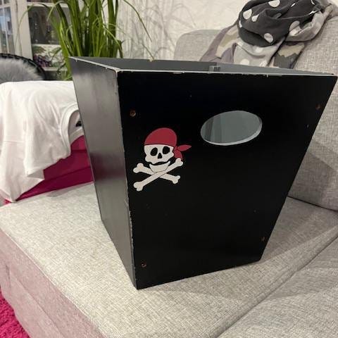 En vit låda med snidade fjärils- och trollsländemotiv i trä. Perfekt för barnrum. Hämtas på plats.
