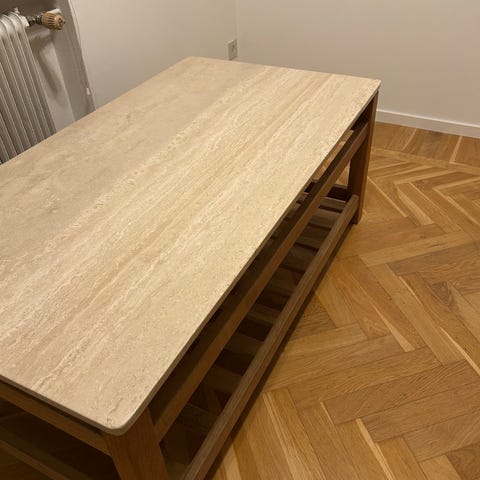 Soffbord i massiv ek med svart granitskiva i mitten och ett astningsskiva under skivan.