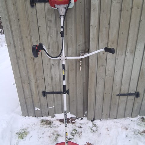 Fungerande Biltema röjsåg/grästrimmer BC43 med trebladig klinga, trimmerspole samt en Jonsered bärsele. Bara selen är värd det dubbla.
