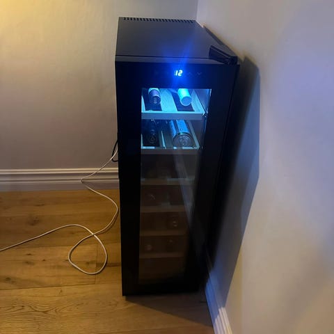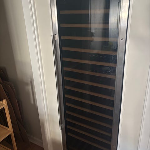 Fristående vinkyl med kapacitet för ca 20 flaskor. Utrustad med trähyllor och en dörr i rostfritt stål med glasfront. Färg svart.