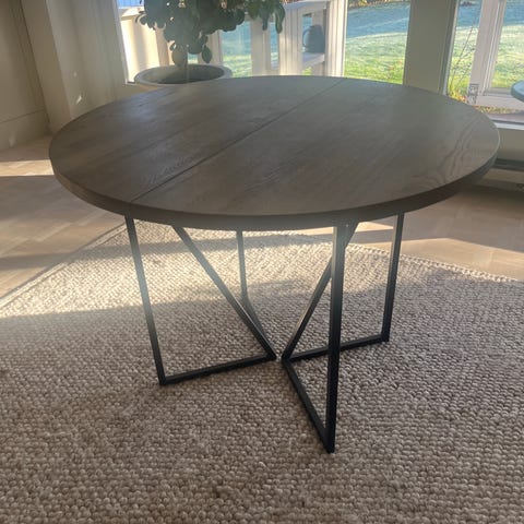 Snaregade bord från Audo Copenhagen är ett runt matbord formgivet av Norm Architects. Bordet har en enkel konstruktion med ett unikt underrede i lackerat stål. Bordet är nytt och har inte packats upp ur originalförpackningen. Bordsskiva i svart-betsad ek, Ø138 cm (Största version). Vi betalade 24 290,- hos Svensson som beställningsvara, men säljer det nu för 10 000,-