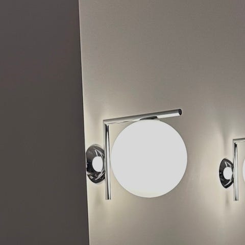 Vägglampa från DCW EDITIONS i den utgångna färgen helvit med koppar på insidan av skärmen för mer behagligt ljus.