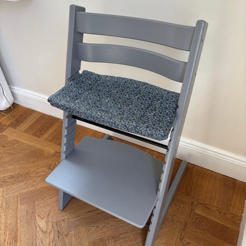 Stokke Barnstolar barnstol i vit färg. Stolen är avsedd för barn och är tillverkad i trä. Den har justerbar sitt- och fotplatta för att anpassas efter barnets storlek. Produkten visar tecken på användning med repor och sprickor i träet.