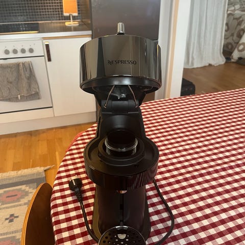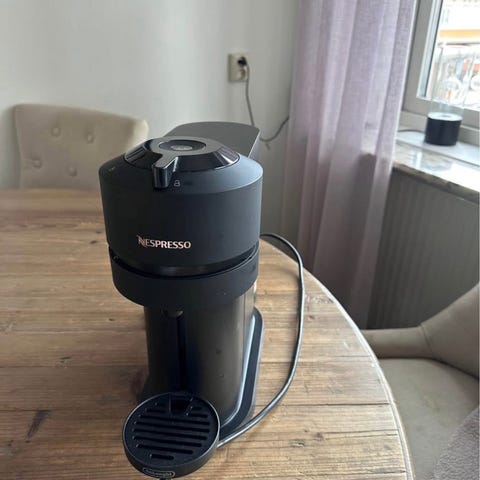 Nespresso Vertuo kaffemaskin i svart färg. Maskinen har en kompakt design och är avsedd för användning med Nespresso kapslar. Den är utrustad med en kapselbehållare och en droppbricka. Maskinen är lämplig för att brygga olika kaffestilar och är enkel att använda.