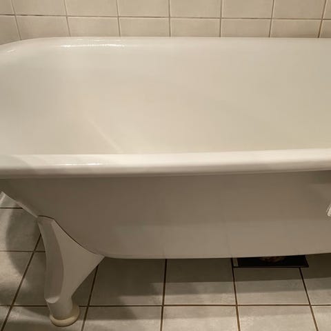 Badkar i vit emaljerad stål med måtten cirka 150 cm i längd. Utrustat med blandare och handdusch. Passar för installation i badrum med standardmått. Någon repa där emaljen försvunnit, ostädat men kan städas innan hämtning. Upphämtning i masthugget.