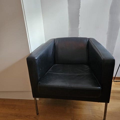 När du sitter i fåtöljen så upptäcker man att den ger mer än man förväntar sig. Sits och ryggstomme av stålrör och plywood, stoppning av formgjutet PUR skum. 2 stycken fåtöljer i svart skinn med dold snurrfunktion. Snurrar man och går upp så återställer den sig i sitt ursprungsläge, med riktiga kullager.