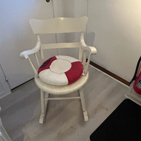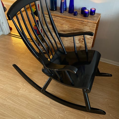 Vit gungstol med sits och ryggstöd i plastmaterial. Stolen har en ram av trä och metall som möjliggör gungande rörelse. Passar för inomhusbruk och kan användas som en bekväm sittplats i olika rum. Hämtas i Järna