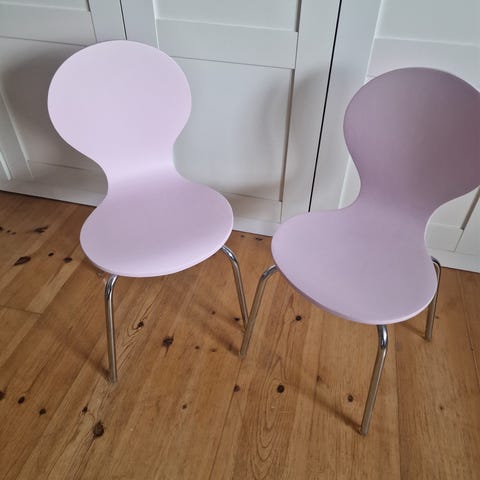Barnstolar med rosa stoppad sits, bricka för matning och säkerhetsbälte för barnets säkerhet. Passar för små barn vid matbordet.