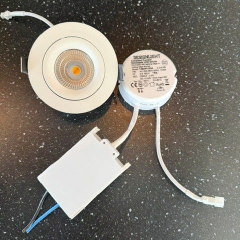 Philips LED’in-1 infälld LED-spot med tillhörande Philips LED’in-1 drivdon. Armaturen är rund och vit med reflektor och COB-LED-modul. Drivdonet är märkt för 220–240 V AC, 50/60 Hz och är avsett för LED-belysning. Lampan är avsedd för infällt montage i tak eller liknande ytor där riktad allmän- eller punktbelysning önskas. Levereras komplett med fast monterad anslutningskabel och stickpropp enligt bilder.Om köper flera kan priset diskuteras.det finns flera.