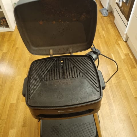 Elektrisk grill med justerbar termostat, svart färg. Grillen har ett galler och en plåt för matlagning samt en underhylla för förvaring. Passar för inomhusbruk och enkel temperaturkontroll med vred från min till max.