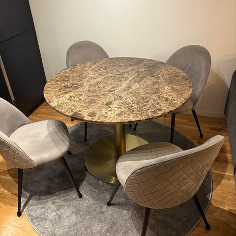 Säljer nu vårat matbord+ 4 stolar från Mio. Mattbordet är 110 cm i diameter.