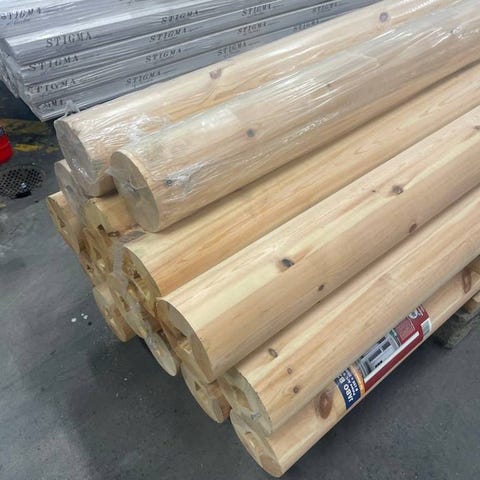 Limträ, fingerskarvad och obehandlat klyvet i hög kvalitet med dimensionerna 28x300 mm och längden 6 meter. Plankorna är staplade och lagrade under tak för skydd mot väder.