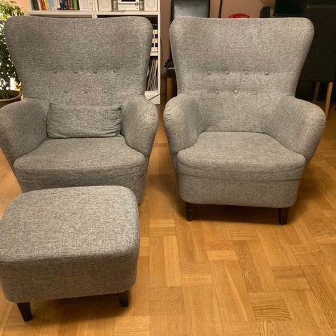 3 fåtöljer som kan snurra i antracitgrå färg med matchande puff som är 110 cm i diameter. Inköpta på EM möbler. Bra begagnat skick men då dom har några år på nacken syns det såklart spår av användning och tyget har några små färgskiftningar. Alltihop för 2 000kr, hämtas i Adolfsberg och det är först till kvarn.