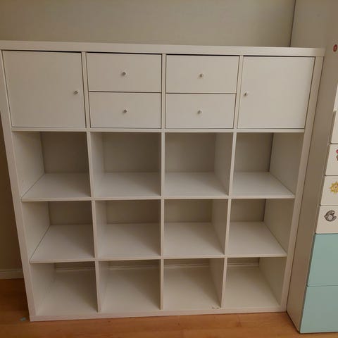 IKEA Kallax förvaringskub i brun valnötsmönstrad finish. Kuben har måtten 35x31 cm och är tillverkad i trämaterial. Kan användas som förvaringslösning eller som del av modulärt hyllsystem.